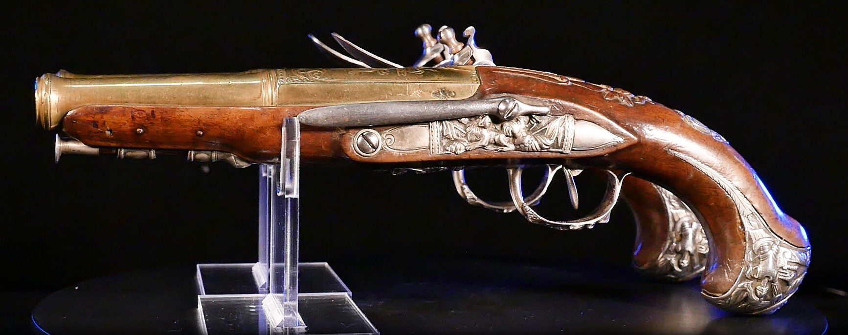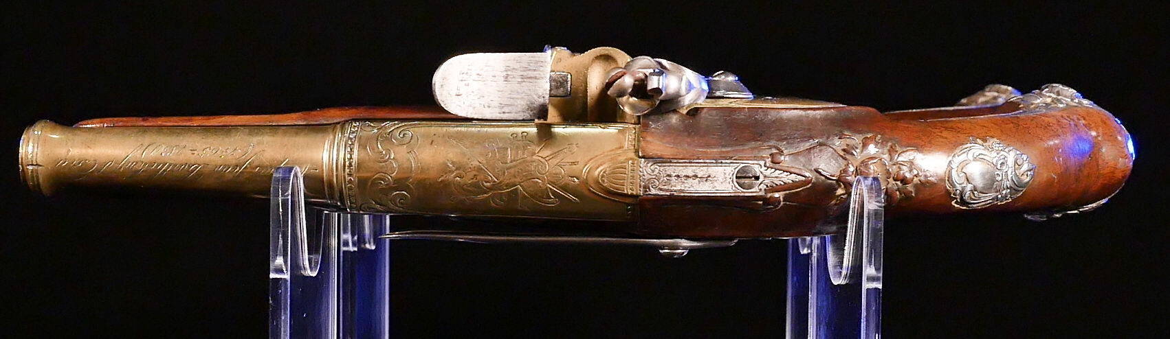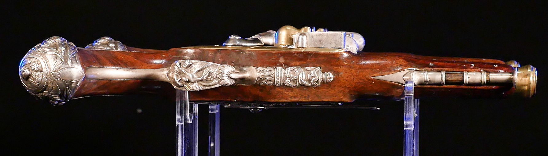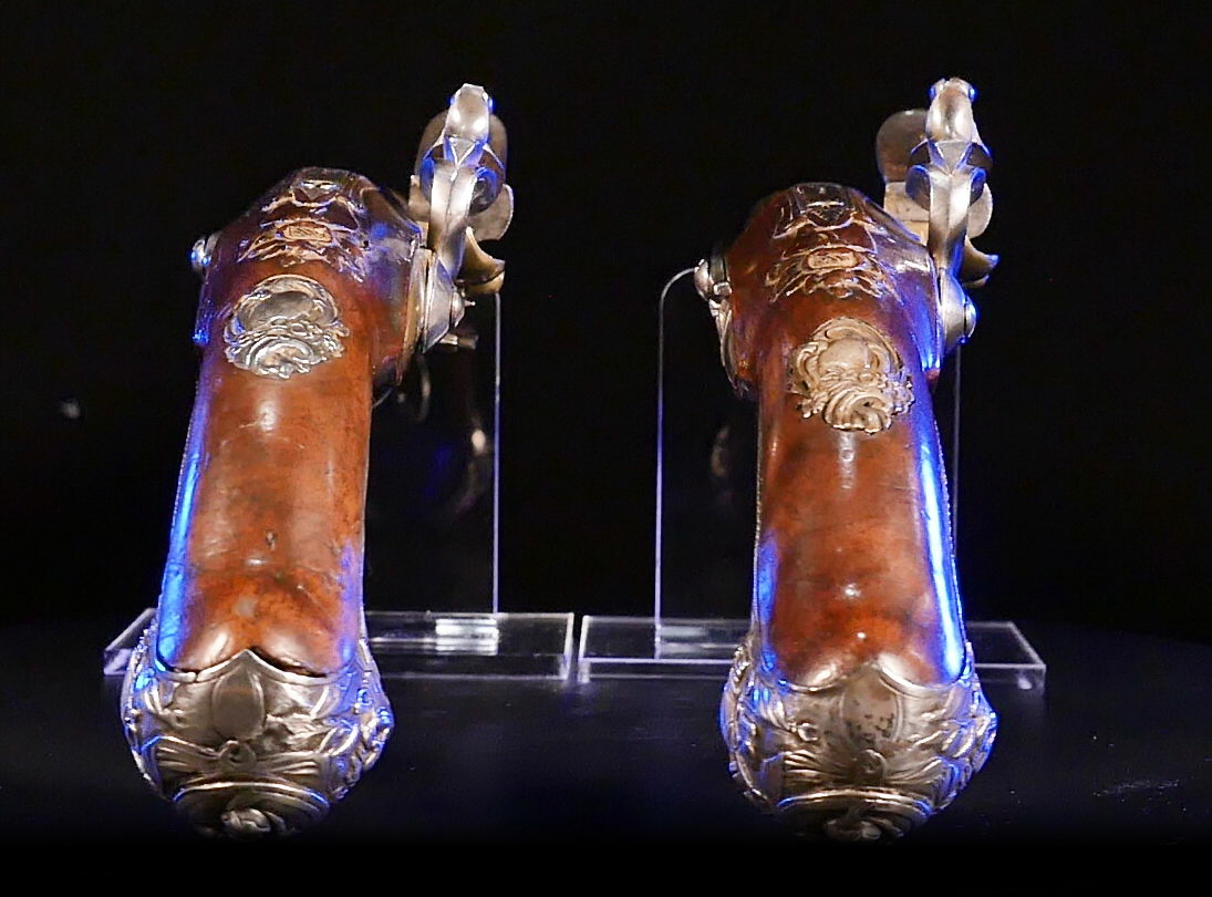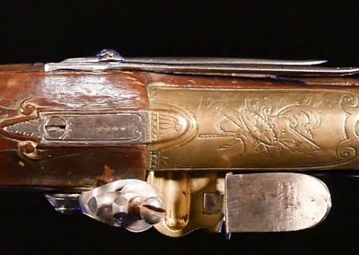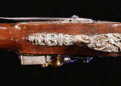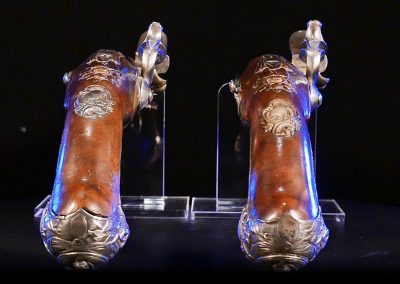 The pistols are fully stocked in carved walnut, are of brass in 14 mm calibre and feature ornately cast sterling silver side plates, trigger guards and butt caps; iron belt hooks and white metal tipped ramrods. The exceptional octagonal two-stage cannon barrels are engraved and bear the Marquis’ name and life years.